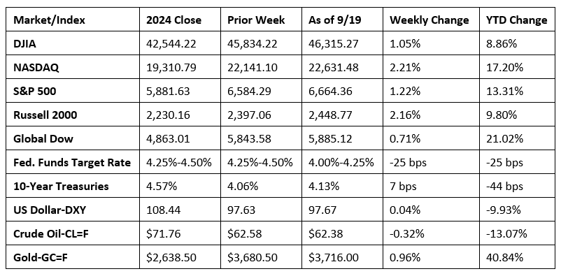 The stock market continued its record-setting run last week with the Dow, the S&P 500, and the NASDAQ each reaching new record highs. The small caps of the Russell 2000 also hit a new high for the first time in four years, which signaled a broadening of the rally beyond tech stocks. The major impetus for last week’s market performance was the Federal Reserve’s decision to trim interest rates (see below) for the first time this year. In addition, the Fed projects that more rate cuts are possible before the end of this year, which investors view as a positive for economic growth and corporate earnings. While inflation appears to have moderated somewhat, the Fed’s challenge is to support a cooling job market without reigniting inflationary pressures. The interest rate cut also influenced the bond market, with 10-year Treasury yields ticking higher as bond prices declined. Crude oil prices fell on concerns about waning global demand, abundant supplies, and implications from the aforementioned interest rate cut.