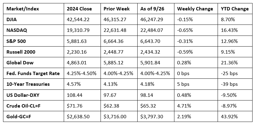 Despite a rebound on Friday, stocks closed last week mostly lower. Each of the major market indexes, the S&P 500, the Dow, and the NASDAQ, declined in value following a record-setting rally that lasted several weeks. Investors pondered the impact of new tariffs on certain imports announced by President Trump as well as mixed signals from the Federal Reserve as inflation remained somewhat elevated, although within expectations (see below). On the plus side, gross domestic product enjoyed a strong rebound in the second quarter (see below), while jobless claims also fell, possibly suggesting a resilient labor market. Among the market sectors, big tech stocks saw some declines amid concerns that AI-fueled valuations might be too high. Shares within the health care sector slid as some pharmaceutical stocks in Asia and Europe fell in reaction to the new tariffs. Ten-year Treasury yields closed higher, rebounding from a five-month low from the previous week. Crude oil prices marked their largest weekly gain in over three months, driven higher by escalating geopolitical tensions.