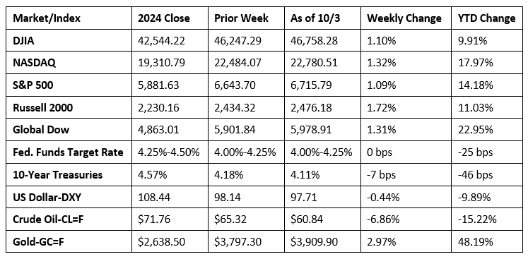 Investor optimism over AI companies and expectations of interest rate cuts helped propel stocks last week. The S&P 500, the Dow, and the NASDAQ reached record highs despite the government shutdown, which caused delays in the release of key economic data (see below). In addition to surging AI stocks, major tech and chip stocks also drove the market. Information technology and health care led the market sectors, while energy showed weakness due to slumping crude oil prices. Ten-year Treasury yields eased slightly during the week, partially due to uncertainty over the employment sector. Bearish crude oil prices were dragged lower by expectations of a production increase by OPEC+.