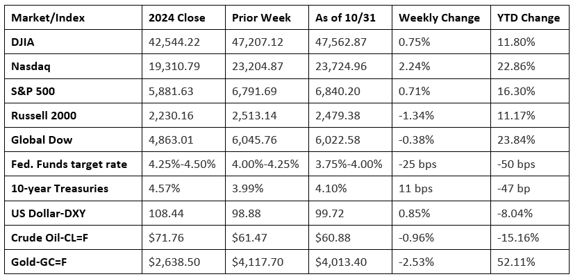 Stocks moved generally higher last week, largely driven by solid corporate earnings from some big tech firms. The S&P 500 and the NASDAQ each reached record highs during the week, extending a significant rally. The push higher was moderated somewhat by the Federal Reserve’s cautious stance on future rate cuts. Despite a lack of updated economic information, the Fed identified concerns about the potential for a weakening job market and stubbornly elevated inflation rates. While trade tensions between the U.S. and China were tempered following a meeting between President Trump and Chinese leader Xi Jinping, analysts cautioned that underlying issues still had not been resolved. Following last week’s interest rate cut, U.S. Treasury yields rose sharply, extending a three-session rally that pushed the 10-year Treasury yield to a three-week high. Despite an early-week rally, crude oil prices dipped lower last week, primarily due to concerns of global oversupply and increased production.
