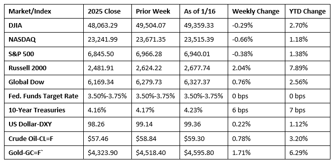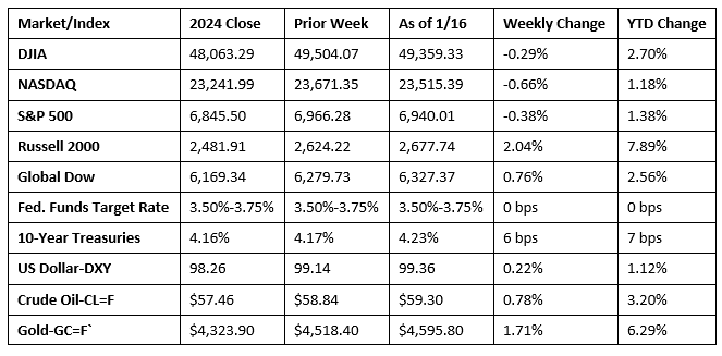 The U.S. stock market endured quite a bit of volatility last week. A rally last Thursday wasn’t enough to prevent the three major market indexes, the Dow, the S&P 500, and the NASDAQ, from closing in the red. The Global Dow and the small caps of the Russell 2000 posted modest gains by last week’s end. After starting the week with mixed to higher returns, results turned choppy mid-week before Thursday’s rebound. Friday saw stocks tick lower. Consumer staples, industrials, and real estate led the market sectors, while financials underperformed. Last week marked the start of fourth-quarter earnings season, which delivered mixed results from some major banks, although the semiconductor sector provided a major boost. Investors had to decipher plenty of economic news and data, including a pending tariff ruling by the Supreme Court, domestic and international upheaval, the Justice Department’s investigation of Federal Reserve Chair Jerome Powell, and inflation data that was unchanged on its face, but showed rising shelter prices, food costs, and energy prices. Crude oil prices rose for the second straight week, influenced by lingering geopolitical risks versus easing fears of an immediate U.S. strike on Iran.