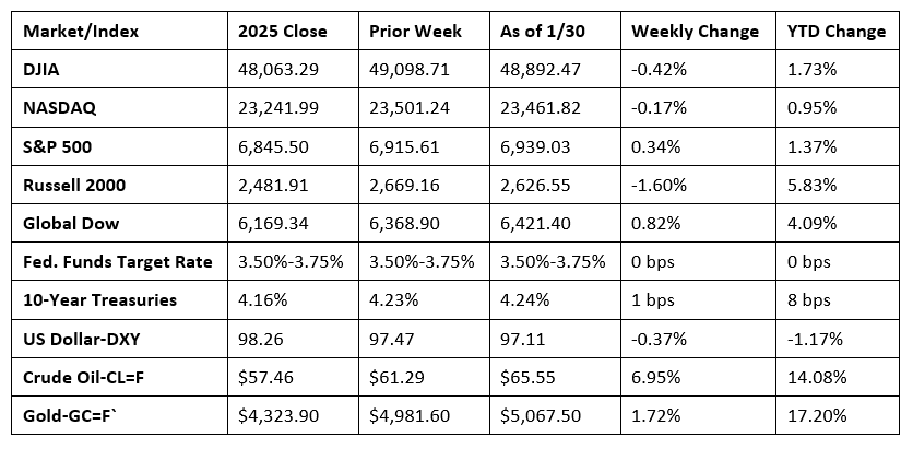 Equities ended the week mostly lower as investors parsed through a heavy slate of fourth-quarter earnings data, economic reports, high valuations, and the Federal Reserve’s decision to maintain interest rates at their current levels. Several of the benchmark indexes hit notable highs midweek, with the S&P 500 surpassing the 7,000 level. Nevertheless, stocks generally retreated by the close of trading last Friday, with only the S&P 500 and the Global Dow able to end the week higher. Seven of the 11 market sectors closed the week higher, led by communication services and energy. Of the remaining sectors, health care saw the largest decline. Ten-year Treasury yields and the dollar were relatively unchanged from the previous week. Crude oil prices continued to trend higher, supported by rising geopolitical tensions.