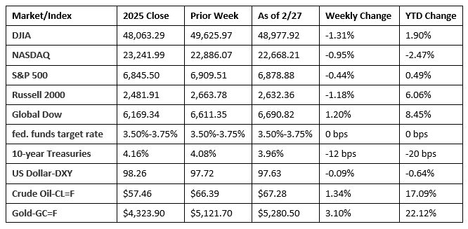 The last week of the month proved to be a tough one for Wall Street. Each of the benchmark indexes listed here closed the week lower, impacted by stubborn inflation and a cooling of major tech and AI stocks. The Producer Price Index rose faster than in the previous two months (see below), which fueled fears that the Federal Reserve will keep interest rates at their current level for longer than investors hoped. Geopolitical risks provided a backdrop of uncertainty. U.S.-Iran tensions escalated, which directly impacted crude oil prices. Financials and information technology were laggards among the market sectors, while defensive sectors, such as consumer staples, utilities, and health care, outperformed.