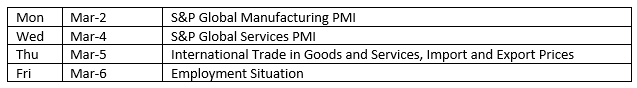 The labor figures for February are out this week. New jobs grew by 130,000 in January. Also out this week are the February purchasing managers’ surveys for both manufacturing and services.