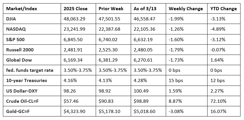 Wall Street saw a third straight week of losses as rising oil prices sparked inflation fears. Each of the benchmark indexes listed here declined as investors moved away from risk. Last week was marked by intensifying geopolitical conflict in the Middle East. The week began on a high note, with markets pushing past early losses to finish in the black. However, persistent concerns about crude oil supplies and surging prices, plus disappointing economic data, pulled stocks to their lowest levels this year. Crude oil prices remained well above $98.00 per barrel, up over 70% for the year. The majority of market sectors closed last week with losses, led by financials and consumer discretionary. Energy, consumer staples, and utilities ended the week higher. Treasury yields rose, with the 10-year note reaching its highest level since January after gaining 15 basis points.